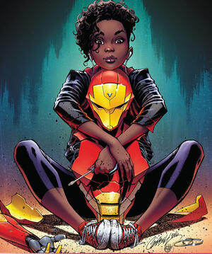 Riri Williams is a 15 year old girl from Chicago, Illinois. She was born to Demetrius (her name came from his nickname!) and Ronnie Williams. She has a sister named Sharon and a step-father named Gary.Riri was a certified genius at age 5. She only had one friend; Natalie Washington. Sadly, Natalie and her step-father were shot in the heart and killed during a drive-by shooting — hence the name Ironheart — and became a superhero to combat gun violence.She got a scholarship to M.I.T.. Before dropping out, she stole parts to make her first suit. After Tony Stark fell into a coma during the events of Civil War II, she took over the responsibility of Iron Man.She now is a member of the Champions, a group of young heroes that consists of Ms. Marvel (Kamala Khan), Spider-Man (Miles Morales), Nova (Sam Alexander), and others.
